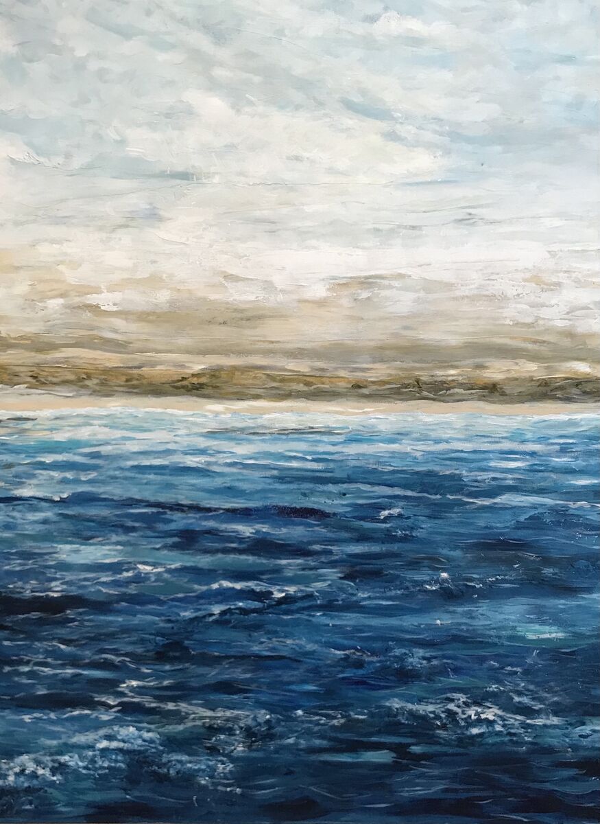 This work seeks to evoke the experience of summer and the cooling calming effect of the ocean contrasted against the sandy shores. The artwork comes ready to hang and has a handcrafted mercantile hardwood frame finished with danish oil.